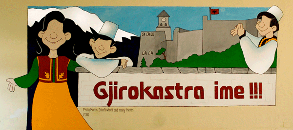 Painting a mural in Gjirokaster, Albania, was simply a no brainer for me. I had friends there to make any and all of the necessary local connections. All that needed to be done was locate a wall to paint. I left that in the very capable hands of Vita. She went to her local school. It really was her local school. Both she and her husband, as well as their two children, attended the Urani Rumbo School. There was no way the director could say no when a "world famous artist" offered to paint a mural for them. World famous or not, there was no way the director was going to say no to one very determined Vita Kotoni. She was a woman with a purpose. I actually had reservations about painting at a school. My previous murals were at places like a burn center and an Aids daycare. I'm not sure why I had any second thoughts. The kids at Urani Rumbo totally amazed, impressed, and overwhelmed me. There was a flood of kids willing and wanting to paint. Yes, there was some chaos. And, yes, it was a bit overwhelming in the beginning. However, the main emotions to last long after the brushes had been put away were utter joy and deep pride. The students loved what they were doing. There was laughter, smiles, and some paint on a few faces. There was even fresh graffiti -- in English -- on the bathroom walls in red paint that said, "fun!!" My text, also in red paint, read "Gjirokastra ime!!" which translates "My Gjirokaster!!" There was a sense of pride that this project was painted for their school and community. But, there was probably a greater pride that they helped create the mural. Much to my amazement, in three and a half hours, the entire mural had two coats of paint. When the students left school, they were so excited to show their friends what they had done. That was the kind of ownership I wanted them to have. But, they wanted to own more. They wanted a second mural. Many people who I talk to about the murals say they want to come with me and paint. Few actually mean it. However, John was the exception. He had the time to help, and even though his wife was envious, he had her blessing to go to Albania for ten days. Not only did he help with a lot of the painting, but he took on the role of official photographer. He documented every step of the murals (taking about half the photos on this site) and then made PowerPoint presentations for the school and our hosts so they could never forget the experience. He made my third trip to Albania much easier and a lot more fun. |