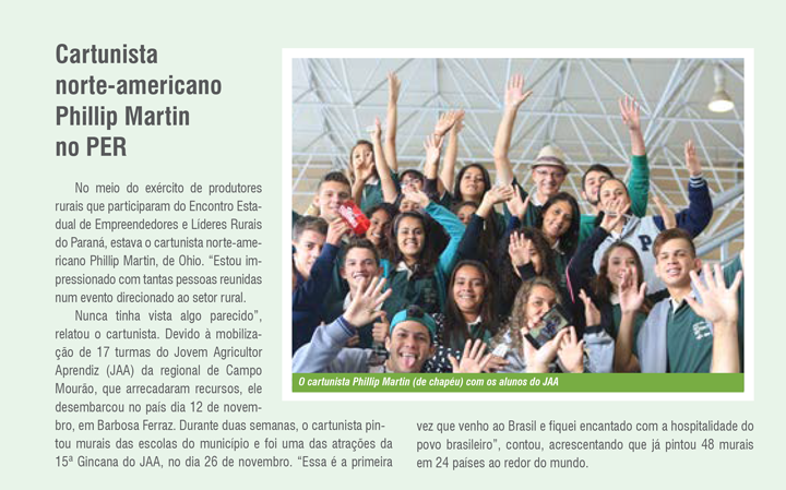 In the midst of the army of rural producers who participated in the state meeting of Entrepreneurs and Rurals Leaders of Parana was the North American cartoonist Phillip Martin of Ohio. "I am impressed with so many people gathered at an event targeted at the rural sector." Due to the mobilization of 17 groups of the Young Farmer Apprentice (JAA) from the Campo Mourao regional, which collected resources, he landed in the country on November 12 in Barbosa Ferraz. The cartoonist painted murals in the schools of the municipality and was one of the attractions of the 15 JAA's Gymnasium on November 26. "This is the first time I come to Brazil and I was delighted with the hospitality of the Brazilian people," he said, adding that he has painted 48 murals in 24 countries around the world. |