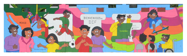 Actually, it wasn’t so easy to fill eleven yards by three yards with three letters either. Well, with suggestions from Ismael and his coworker Erica, I wove my magic to create a design that pleased me. It was very important to show parents and children playing together. So, I added a piñata party to the design. Then, there were kids playing football (soccer for those of you in the United States) and skateboarding, a classroom situation with a diverse student population, and finally my personal favorite addition. Two kids in the middle of the mural are signing, “Bienvenidos” (welcome, for the Spanish challenged). The people from DIF thought that was an excellent idea. Hey, I recycle great ideas when they come my way. (In Transnistria I worked with deaf students, you may recall.) DIF was way more organized than what I am used to. I had my list of colors. Instead of going to the neighborhood paint store, we visited the maintenance department on campus. They had nearly every color I needed. And, if they didn’t have what I wanted, they mixed it up on the spot. While I watched that whole creative process, a crew of three scraped loose paint off my mural location and covered the wall with two coats of white paint. They have no idea the amount of stress they didn’t heap upon me. I wish I could always travel with a maintenance department. Throughout the mural process, I had students and other people from DIF (none more special than Little Stevie Wonder) as well as volunteers I referred to as Team Carlos. My Playa del Carmen landlord, Carlos, used social media to bring several of his friends into the project. It seriously would have been much more of a struggle without Team Carlos. But, it also gave me one of my best chuckles with this mural. People closely involved with project quickly recognized the three letters, DIF, woven into the design even though parts of the letters were obscured. However, one member of Team Carlos asked, “Why do you have DIE right in the middle of the design?” I think he’ll have to do some more volunteer work. |