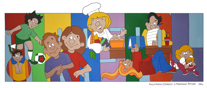 thought. It was suggested that maybe I throw in something "national" to give the mural a local flavoring. I usually try to do that anyway. But, I was warned I couldn't draw anything controversial. However, anything "national" was bound to be controversial in this situation. The Transnistria flag has the yellow hammer and sickle that used to adorn the old USSR flag. It looks nothing like the Moldovan flag. Using any flag was going to be flaming controversial. Okay, no flags. Maps were