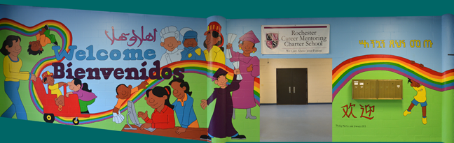At the bottom of all my email messages is a link to explore my travels, clip art and murals. Stacey took the time to check out that link. And, if you really check it out, it could take days. Then, she wrote to me, "What would it take to get you to paint a mural in Rochester?" And, that's what brought me to New York. The location of the mural is at Entrance 3 of a huge building at 30 Hart Street in downtown Rochester. It used to be some clothing warehouse in days gone by. Now days, part of the building was a Catholic school, part was a Head Start program for wee ones, and another part was a mentoring program for charter high school students. At Entrance 3, you find your way to the Head Start and mentoring program. The mural design needed to capture the international flavor of the students at the schools as well as blend in a mixture of wee ones with mentored teens. The design welcomed people in English, Spanish, Arabic, Chinese and Amharic. The art was linked together with hats. In the Head Start program, the children played with hats of a fireman and a baker. In the mentoring program, students studied and trained for different professions where they might wear the hats of a chef, the police or a firefighter. At the end of the mural was the hat that every student hoped to wear, a graduation cap. It was a hat that brought me to Rochester in the first place. Stacey's collection of international hats, numbering around thirteen hundred, was simply mind-boggling. (Check them out here!) I was so pleased that for this particular mural, it was a collection of hats that gave the design a unifying theme. |