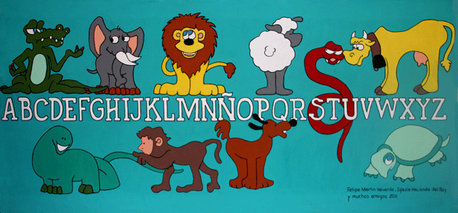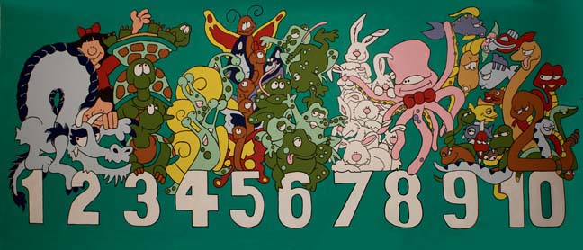 And, it certainly was a different world. The border crossing had no machine gun toting soldiers (at least I didn't see any) and there were no signs about conquering anything. There was, however, duty free shopping, souvenir shops and a lot of hammocks for sale. It's my observation that if you want a typical Nicaraguan souvenir, you get yourself a hammock. San Jose, Costa Rica, is in the mountains with a cooler climate. The bus to the border was air conditioned. So, the first thing I really noticed about Nicaragua was the heat. I never stopped noticing it. There was no way to not notice wet hair and t-shirt sticking to my skin by eight thirty in the morning as I walked from the orphanage grounds to the school campus. It wasn't a long walk, and it was their winter season! Upon arrival I was always drenched in sweat. The teachers in the two classrooms getting murals at the orphanage run school were not picky. They didn't care what they had painted on the walls. They were simply thrilled to get murals. So, the teacher in me took over and I suggested a number chart and an alphabet chart. They loved the suggestion and I knew where to get the art. Most of it had already been drawn for my website. I just had to do a little rearranging. The number chart was by far, no competition, hands down, the most complicated mural I've ever designed. And, I loved it. |