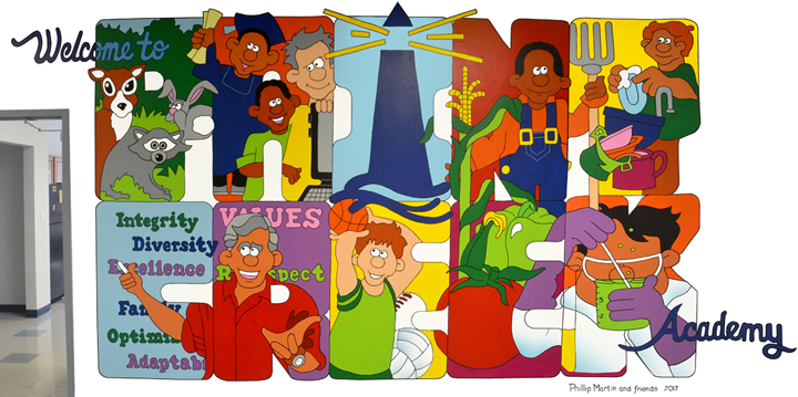 Click here to see larger version. Mural 52, Lighthouse Youth Center Paint Creek, Bainbridge, Ohio One day my friend Anne called me up to see if I was free. My life in Ohio usually has something to do with me sitting in front of a computer screen all day long. Any kind of diversion is welcomed. Yes, I was free. What did she want to do? Anne wanted to take me to a juvenile correctional facility. The Lighthouse Youth Center at Paint Creek is a place for young juvenile offenders to go instead of prison. It’s an amazing location that changes lives. Depending on the year, they’ve had a success rate of over 80% in keeping young offenders from repeating the problems that brought them to Paint Creek in the first place. That’s a whole lot of changed lives for the better. The first thing I noticed about the complex was there were no fences. It doesn’t take the young men long to realize they are in a place that can help them, surrounded by people who care. And, the boys are smart enough to know they’d be in serious trouble if they tried to leave. However, in all honesty, leaving would be a challenge. Paint Creek is in the middle of nowhere, surrounded by beautiful Ohio farm country. There is nowhere to go if you left on foot. The closest village, Bainbridge, looked like it might be big enough for one set of traffic lights. It had two. But, the place possessed one very huge claim to fame. The very first dental school in the United States was in this little Ohio village. Anne's brother was the CEO of the organization that ran this center as well as a host of other activities in southern Ohio. And, he was retiring. So, our reason for this visit was a ceremony in his honor. As I waited around, one man approached me and happened to ask, "What do you do?" Well, I had a lot to tell him because I can't just say, "I paint community murals," and drop the conversation. I had about fifteen minutes of uninterrupted conversation to explain what I do -- to the new CEO of Lighthouse! That's how my mural at Paint Creek happened. I visited the center a second time prior to the mural to measure the location and brainstorm ideas. Very fortunately for me, they gave me a free hand to do most of what I wanted. They liked the idea of hiding “Paint Creek” in plain sight with huge block letters. Illustrating the letters were some of the local animals found in the surrounding woods, computer technology, the Lighthouse logo, agricultural products grown on campus, kitchen dish duty, important values reinforced at Paint Creek including integrity, diversity, family, excellence, optimism, adaptability and respect, as well as a science classroom, recreational athletics and graduation. Plans were to arrive at Paint Creek on a Sunday night and be all rested and ready for Monday morning. Plans often don’t work out the way they are planned. This was one of those times. My brother needed to be delivered to the airport at 4:00 AM Monday morning, and I was his best option. I went to bed early, at 9:30 PM, to catch a few zzzz’s. It didn’t happen. I was still wide awake four or five hours later. I dropped my brother off at the airport and drove on to the mural site. I had a little cabin overlooking the compound. The door was open and I tried unsuccessfully to sleep for two hours. I really need seven or eight hours of sleep to function. I should have been in a zombie condition the entire day. It didn’t happen. I found myself surrounded by such nice young men who were very interested in the mural project. It was so hard to imagine these were boys who had gotten in trouble with the law. They were so polite and friendly. One of my hosts explained, when they get away from the streets where they have to wear an attitude, they are free to show the kind of people they really are meant to be. I liked what I saw. No doubt about it, I was surrounded by young men who were learning to do a lot of things correctly. But, that doesn’t happen by accident. Their lives at Paint Creek were very structured because we all know the math equation teenage boys + too much free time on their hands = some kind of trouble. Nearly every moment of every day and night was planned. The young men walked in single file wherever they went. Boys were not allowed to go any place on campus unsupervised. If they worked hard, they could earn Simi-Independent Living status. Several perks were included, but the one I would have enjoyed the most was walking freely on campus. Only six boys had that status during my visit. Under the circumstances, it should come as no surprise that an adult from Paint Creek had to continually monitor the boys at the mural site. It was for the protection of everyone. If no adult monitor was available, no students were permitted to paint. This was a muraling first for me. It should also come as no surprise, that regardless of the location, there were some people who especially enjoyed the project. One young man really loved science and Cy* was particularly pleased that one letter in the mural was devoted to a lab experiment. He adopted the letter "K". Cy painted the entire letter with minimal help from anyone else. Before other volunteers were permitted to help with "his" letter, they had to meet his standards. And, those were high. Another young man, Art*, painted more than most of the other volunteers. (He was one of the guys who had to be polite to me in the cafeteria line, and it worked out well for both of us.) Art, also an artist, was particularly interested in the entire process of making a mural and bringing a community together to create a piece of art. He told me that when he goes home in the not too distant future, he'd like to see about painting murals in his community. I would really like to mentor Art in accomplishing this goal and creating his first community piece. Time will tell. * Hmmm . . . a "Cy"entist named Cy and an artist named Art. Of course, the names have been changed. |