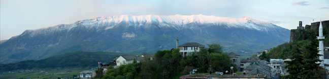 GJIROKASTER, ALBANIAIt's a beautiful town any time of the year, but I love it in the spring when there is still snow on the mountain tops. The panorama viewed here was from the front steps of Vita and Haxhi Kotoni's Bed and Breakfast. Every time I took in this view, any time of the day or night, it was simply breathtaking. |