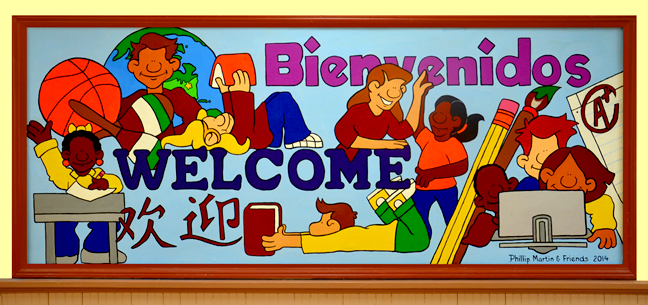 The principal had all kinds of ideas for the mural. Since I never want to show up with my own ideas and always want local input for the concept, this was a very good plus on their part. Diversity had to be included. That was covered by four different skin colors as well as greetings in English, Spanish and Chinese. There actually weren't that many native Chinese speakers in the building, but the students studied Chinese, working their way towards a program sponsored by Ohio State University. So cool! | |||||||